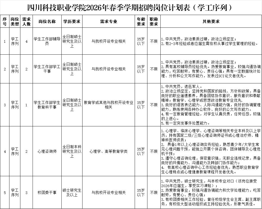 辅导员、各学部/学院专任教师及其他岗位请投递:scstc198@126.com